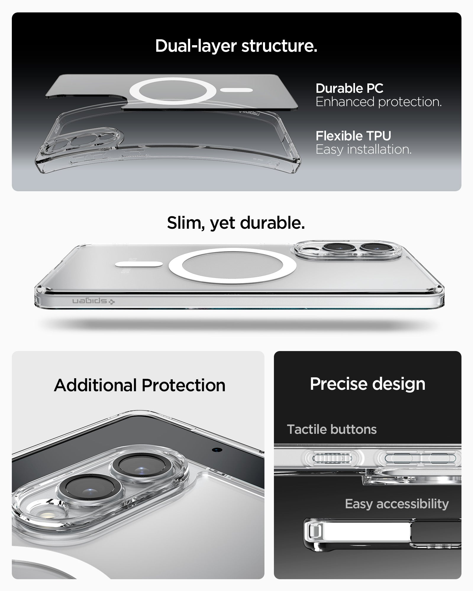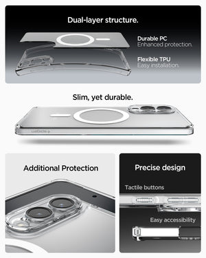 دفاع واضح كالكريستال بدقة مغناطيسية. غطاء Spigen Ultra Hybrid (MagFit) لجهاز Galaxy S25 Edge يجمع بين ظهر شفاف من البولي كربونات وحافة ممتصة للصدمات من TPU. مصمم ليتوافق مع MagFit، مما يضمن محاذاة مغناطيسية سلسة للشحن والإكسسوارات. نحيف لكنه واقٍ، يعرض جهاز Galaxy S25 Edge الخاص بك مع الحماية من السقوط والخدوش والاصفرار.