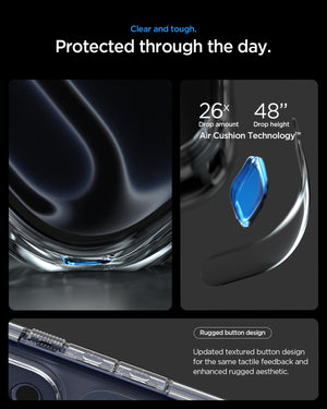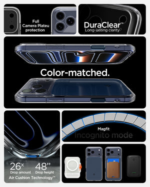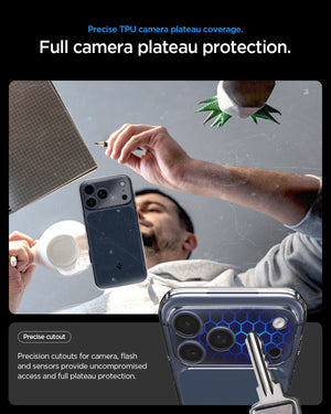 حماية واضحة مع أمان محسن للكاميرا. تجمع حقيبة Spigen Ultra Hybrid T (MagFit) لـ iPhone 17 Pro Max بين ظهر شفاف وواقي TPU للدفاع الهجين. مع التوافق مع MagSafe وميزة Camera Control T الجديدة، توفر غطاء منزلق لحماية العدسة—مع الحفاظ على جهازك نحيفًا وواضحًا ومغناطيسيًا بالكامل.