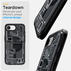 تقدم غطاء Spigen لهاتف iPhone 17e / 16e – Ultra Hybrid Zero One (MagFit) مظهراً مستقبلياً وتقنياً عالي المستوى لجهازك من خلال تصميمه الأيقوني الذي يكشف الأجزاء الداخلية. يعرض هذا الغطاء الفريد المكونات الداخلية المعقدة لهاتف iPhone الخاص بك مع توفير حماية من الطراز الرفيع. مصنوع بهيكل هجين وحلقة مغناطيسية قوية، ليقدم التوازن المثالي بين الأسلوب الإبداعي، التوافق مع MagSafe، والمتانة العالية.